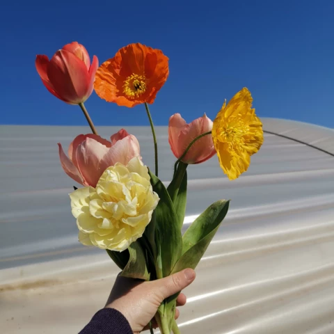Ferme florale agroécologique, Prairie-Fleurs paysannes est une production diversifiée de fleurs fraîches pour des bouquets locaux et de saison. Je cultive sur petite surface, en plein champ et sous tunnel non chauffé, dans le respect de la biodiversité et du sol pour préserver l'équilibre écologique de la ferme. Les variétés cultivées sont choisies en fonction de leurs résistances au climat, leur tenue en vase, mais aussi leurs formes et couleurs pour une palette variée.